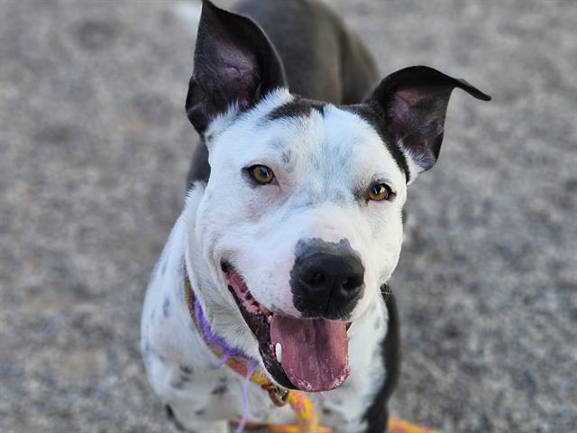 “Who doesn’t love a freckled dog! Lunox looks into your soul with his pretty brown eyes and charms you with his fold-over ears. He has decompressed into a very easygoing boy overall. He has warmed up and grown confidence during his time at the shelter.”