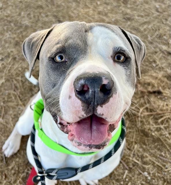 I am a neutered male, white and blue Pit Bull Terrier.