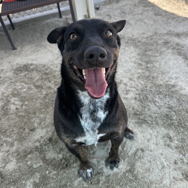 Description: I am a male, 48.00 lbs, black brindle Australian Cattle Dog mix.