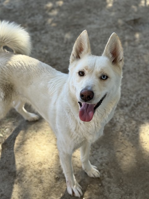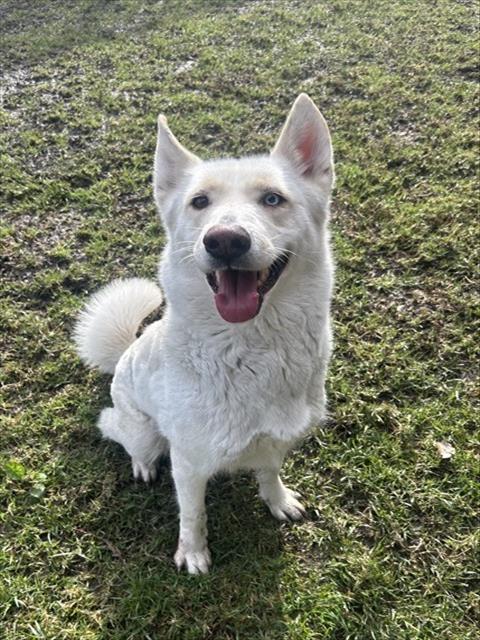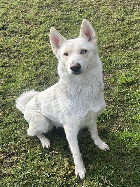 Description: I am a female, 47.00 lbs, white Siberian Husky and German Shepherd Dog.