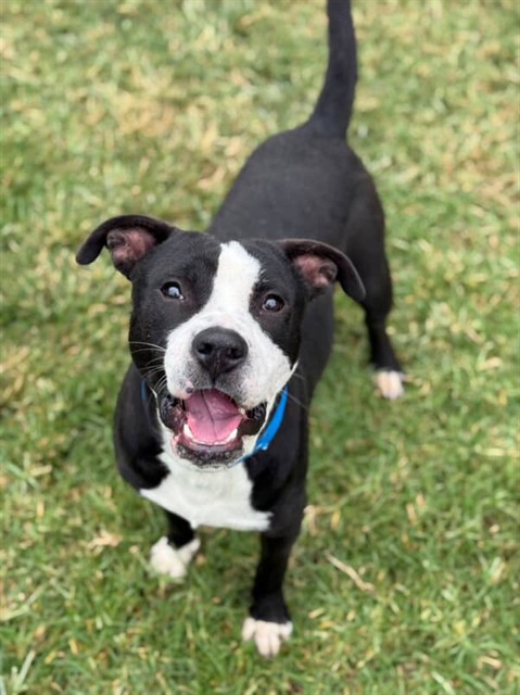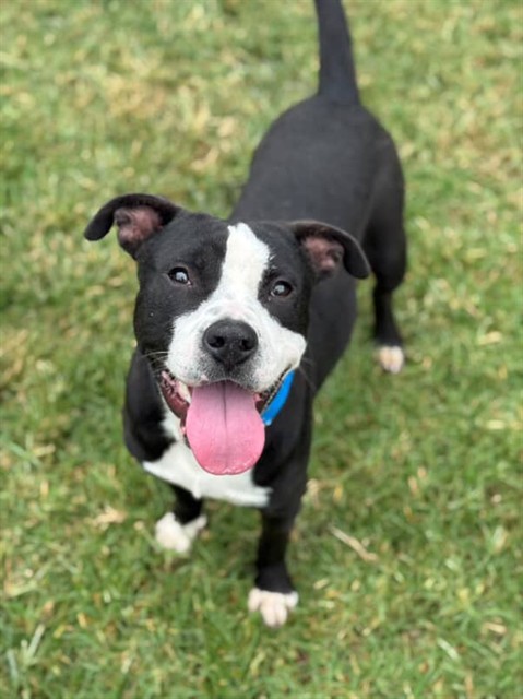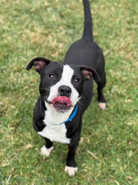 Description: I am a neutered male, 65.80 lbs, black and white Pit Bull Terrier.