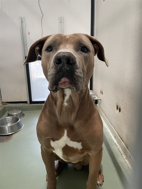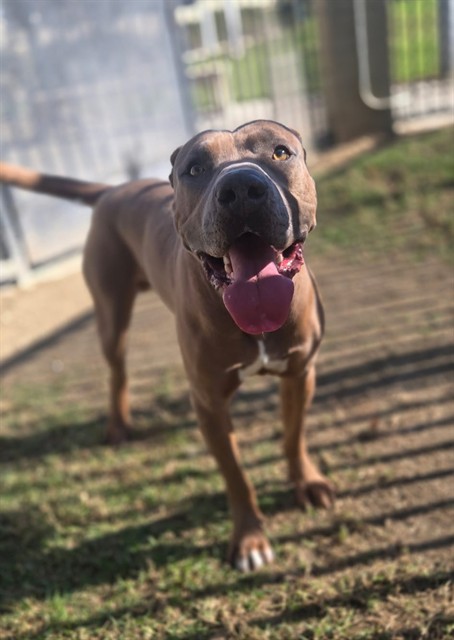 Description: I am a male, 76.00 lbs, tan Pit Bull Terrier mix.