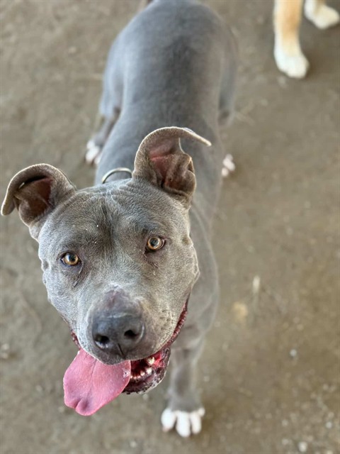 Description: I am a female, 83.00 lbs, blue and white Pit Bull Terrier.
