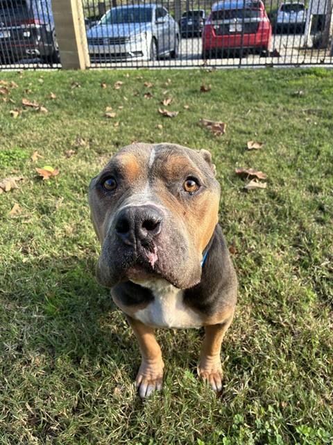 Description: I am a male, 41.20 lbs, brown and white Pit Bull Terrier.