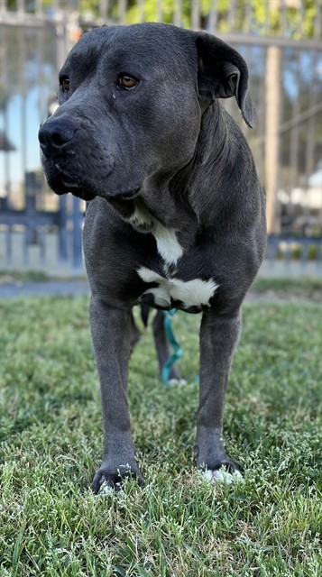 Description: I am a male, 92.60 lbs, gray Pit Bull Terrier mix.
