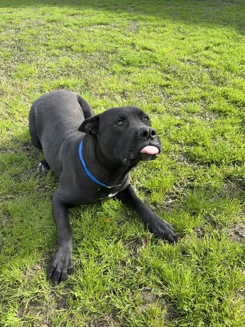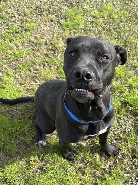Description: I am a male, 74.00 lbs, black Pit Bull Terrier mix.