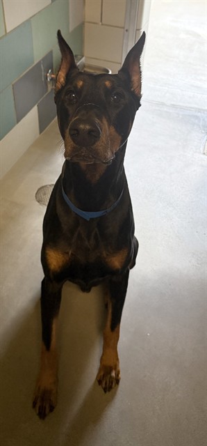 Description: I am a male, 72.00 lbs, black and brown Doberman Pinscher.