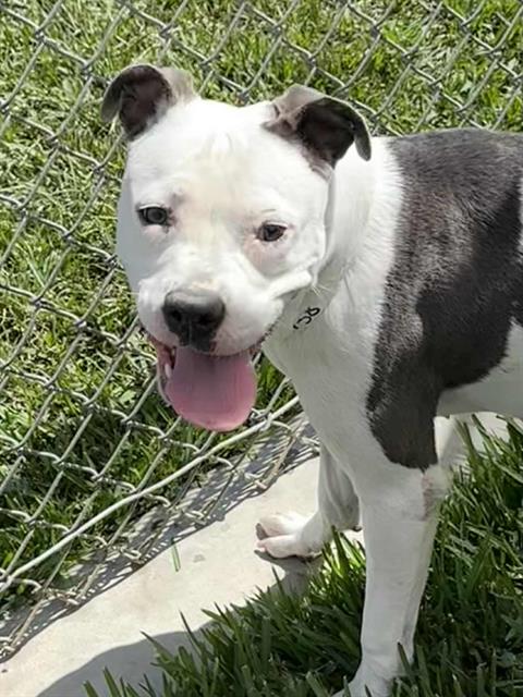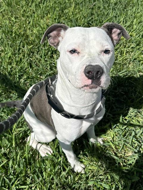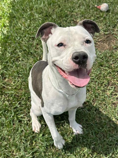 Description: I am a spayed female, 40.60 lbs, gray and white Pit Bull Terrier and Boxer.