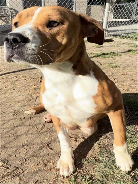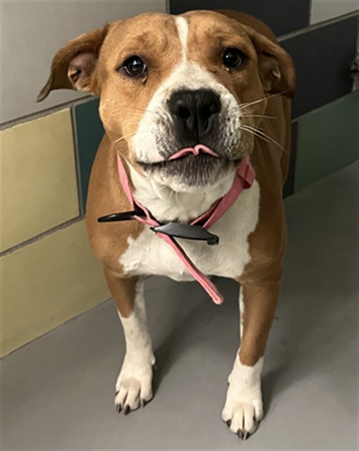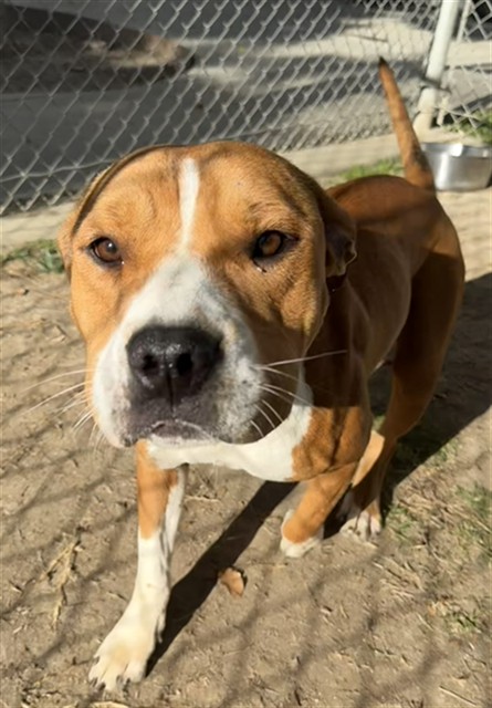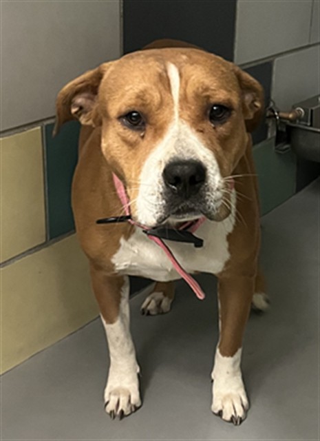 Description: I am a female, 65.00 lbs, tan and white Pit Bull Terrier.