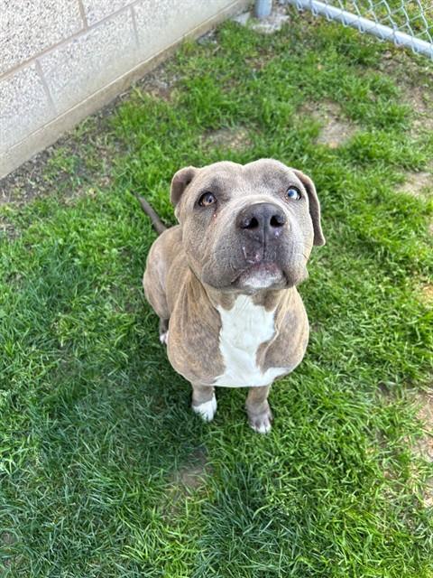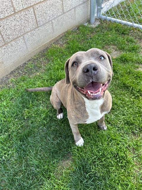 Description: I am a female, 49.00 lbs, gray Pit Bull Terrier.