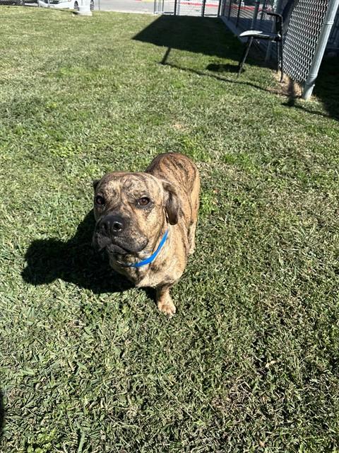 Description: I am a male, 36.00 lbs, brown brindle Pit Bull Terrier mix.