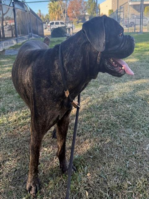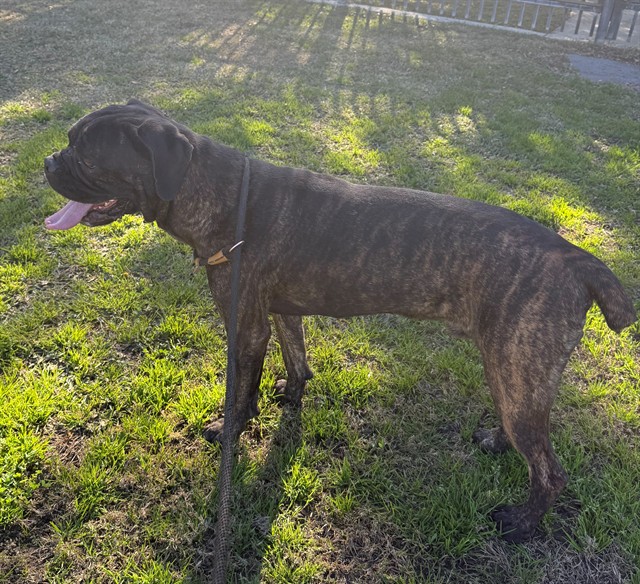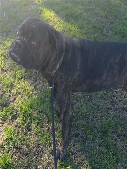 Description: I am a male, 77.00 lbs, black brindle Boxer mix.