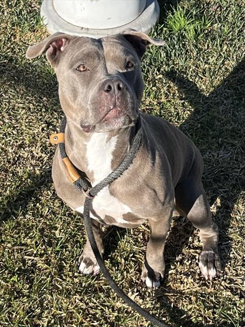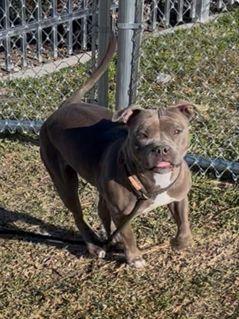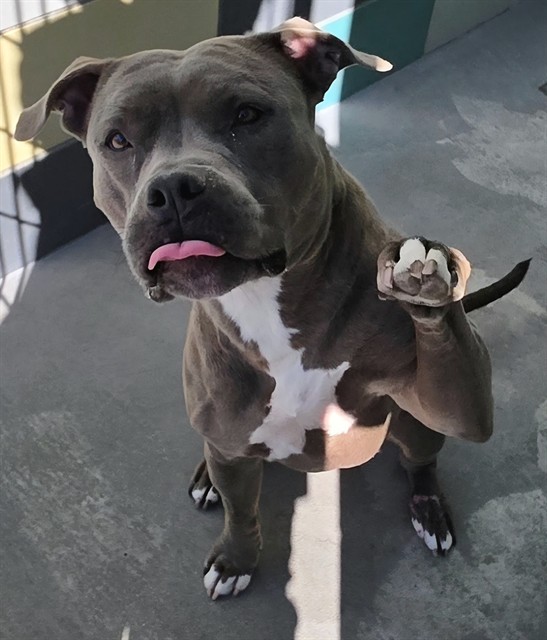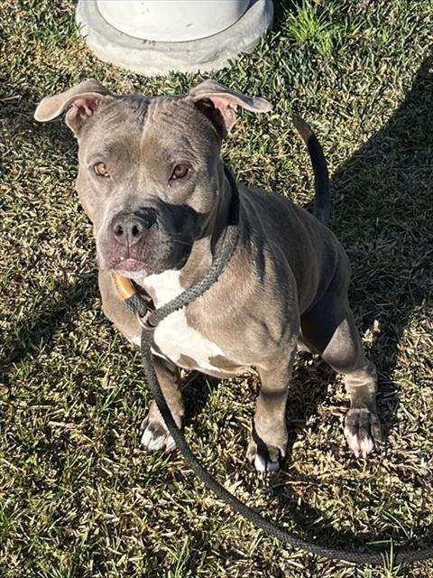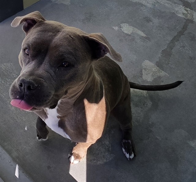 Description: I am a female, 62.80 lbs, blue Pit Bull Terrier.