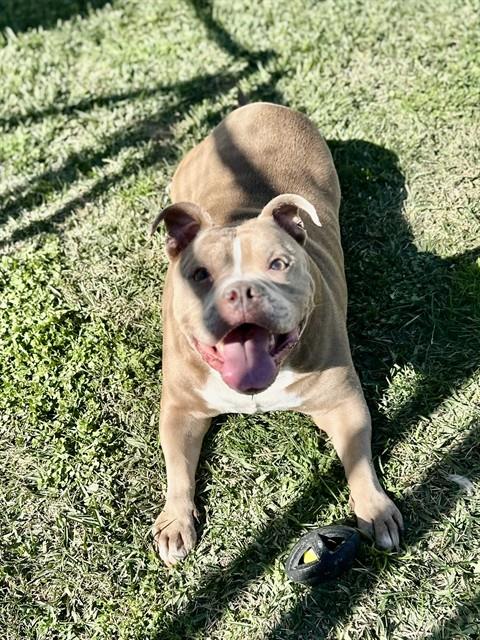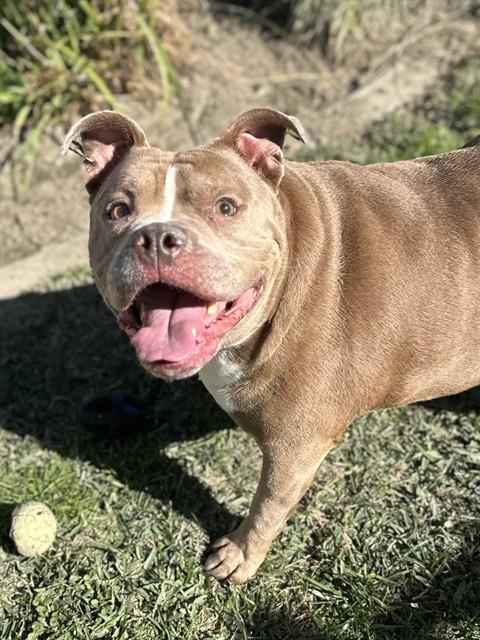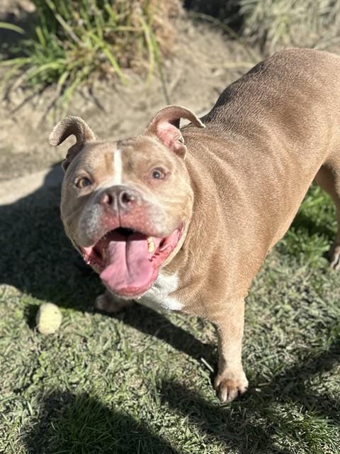 Description: I am a male, 103.20 lbs, brown and white Pit Bull Terrier mix.