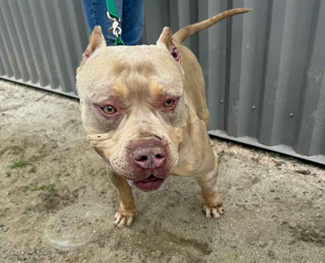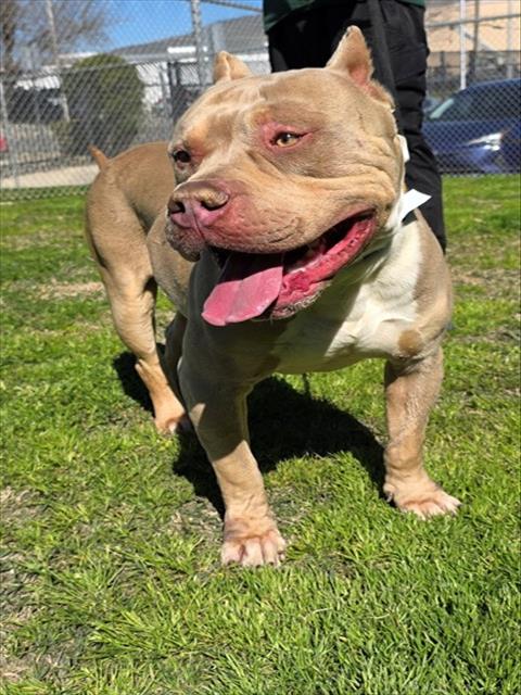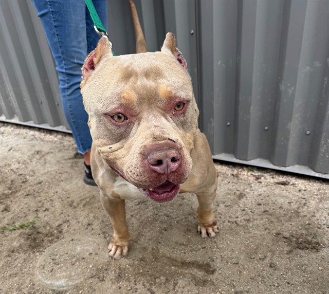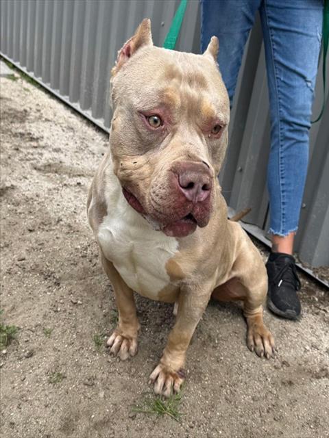 Description: I am a male, 83.00 lbs, tan and white Pit Bull Terrier.