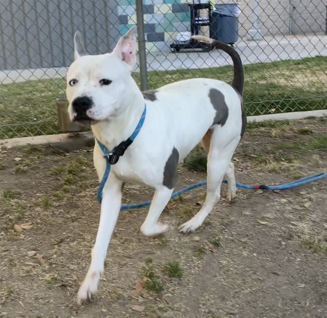 Description: I am a female, 48.60 lbs, white and brown Pit Bull Terrier.