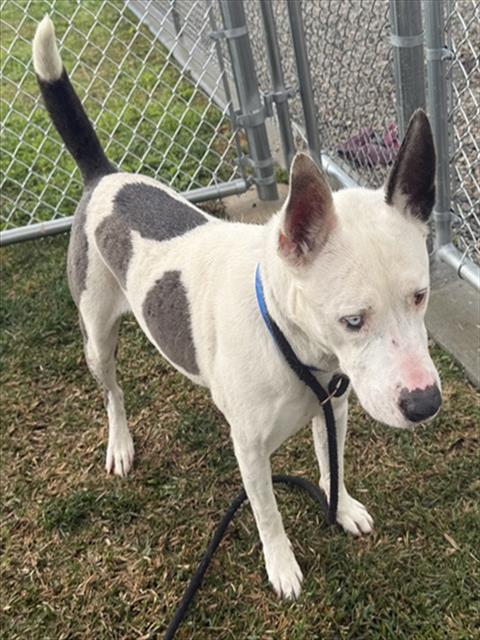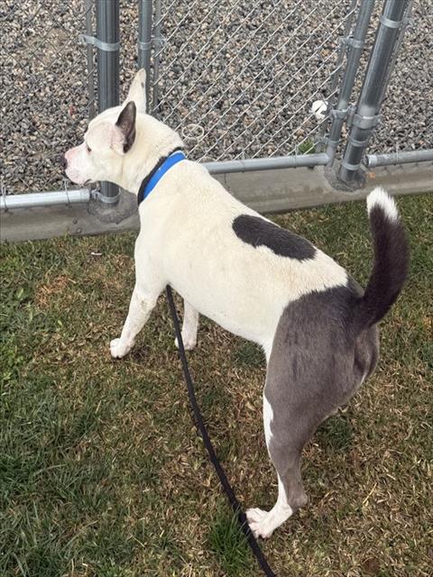 Description: I am a neutered male, 57.40 lbs, white and gray Pit Bull Terrier mix.