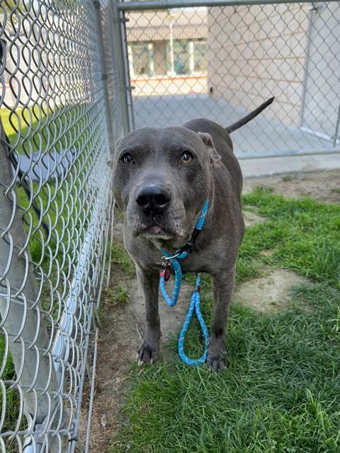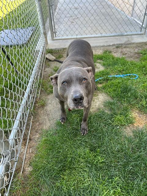 Description: I am a female, 71.00 lbs, gray Pit Bull Terrier.