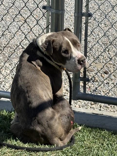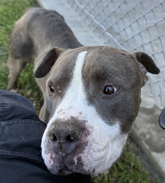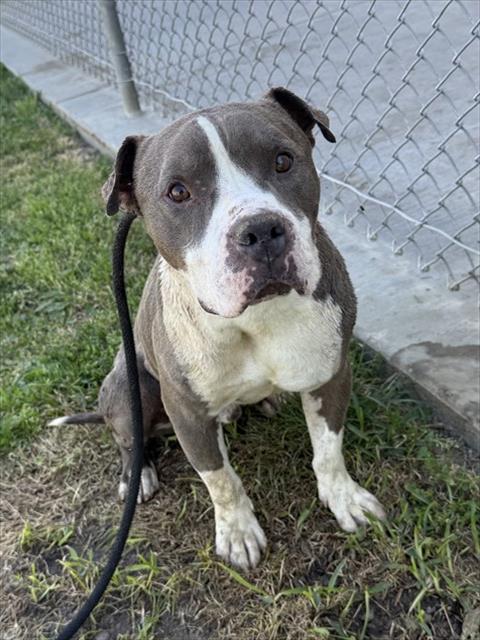 Description: I am a male, 44.00 lbs, gray and white Pit Bull Terrier mix.