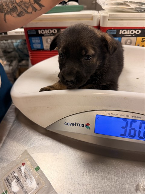 Description: I am a male, 3.60 lbs, black and brown German Shepherd Dog.