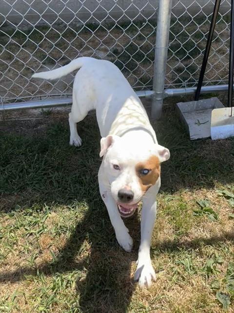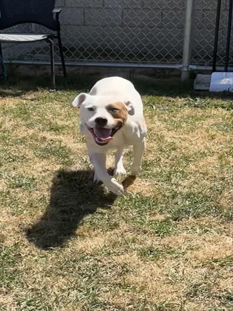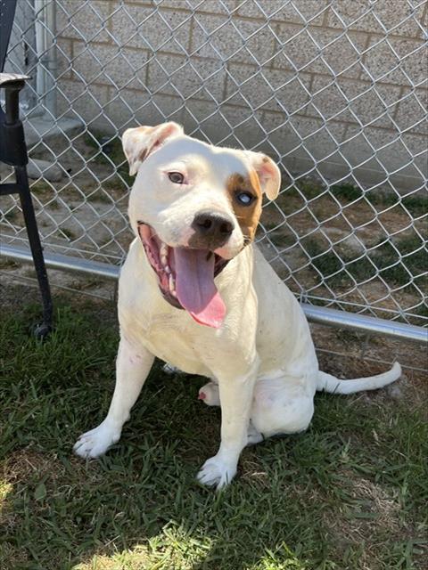 Description: I am a male, 61.00 lbs, white and brown Pit Bull Terrier mix.