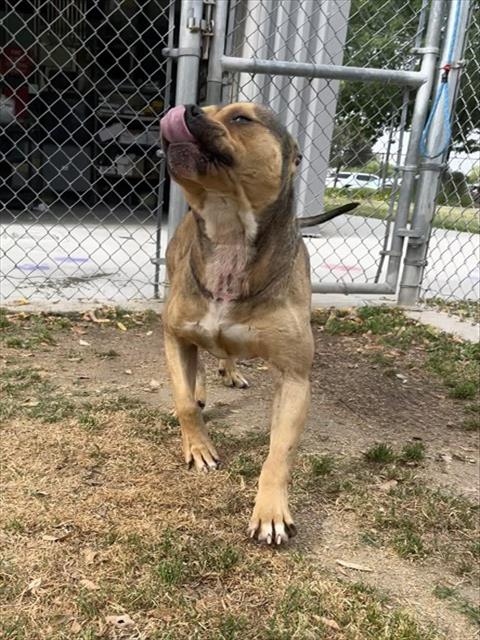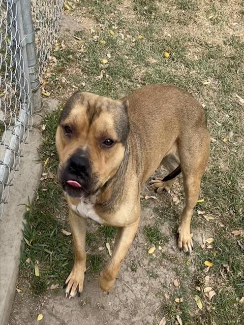 Description: I am a male, 61.00 lbs, brown and black Pit Bull Terrier.