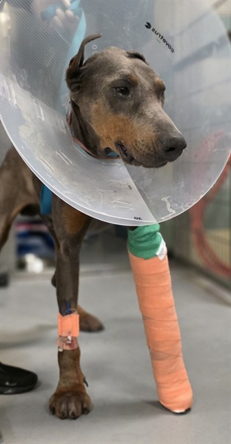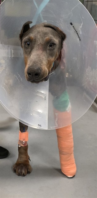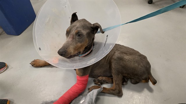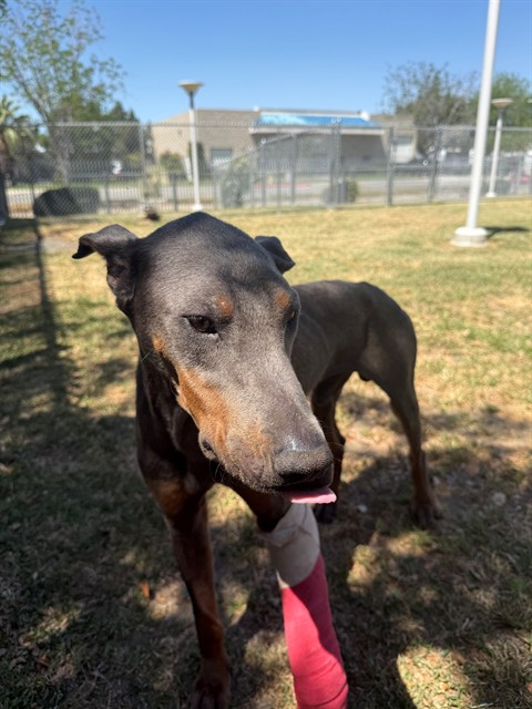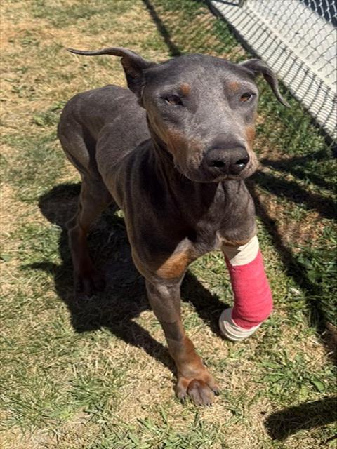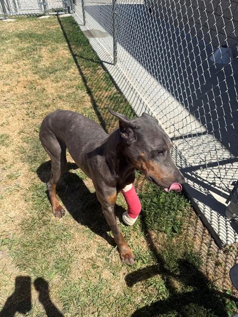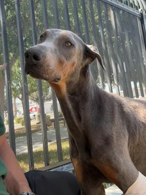 Description: I am a male, 66.00 lbs, gray and tan Doberman Pinscher.