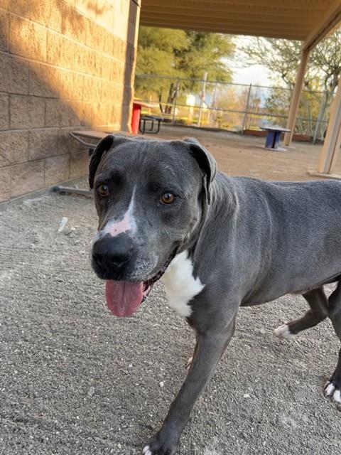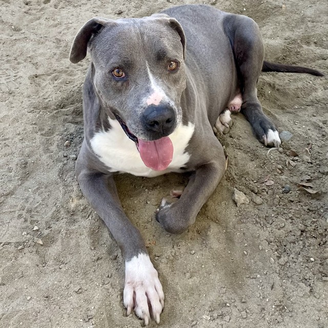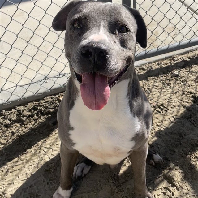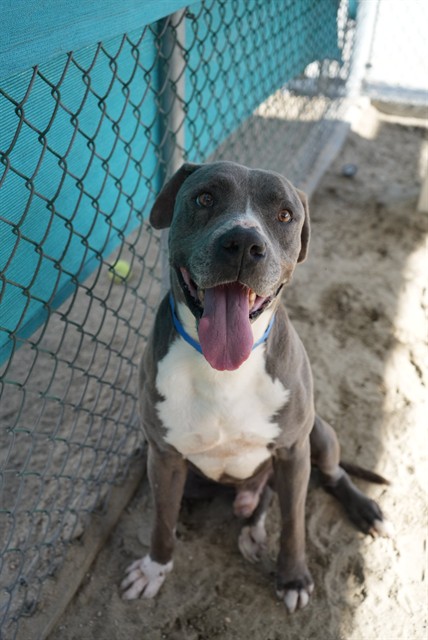 Description: I am a neutered male, 83.20 lbs, gray and white Pit Bull Terrier.