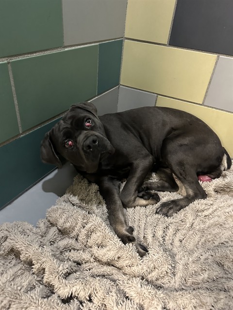 Description: I am a spayed female, 74.40 lbs, gray Mastiff and Pit Bull Terrier.
