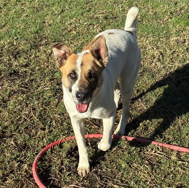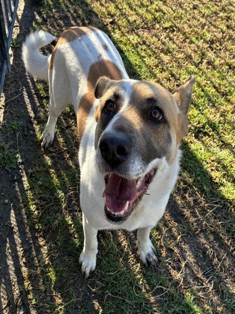 Description: I am a female, 51.50 lbs, white and brown Shepherd mix.