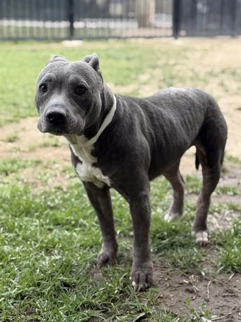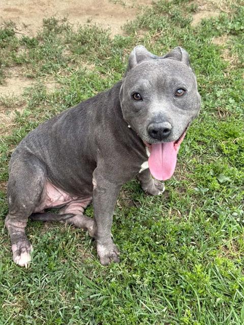 Description: I am a female, 40.60 lbs, gray Pit Bull Terrier.