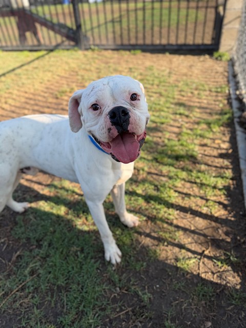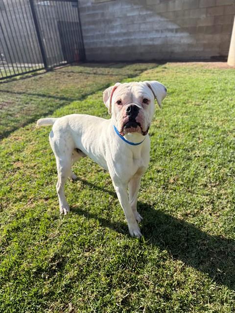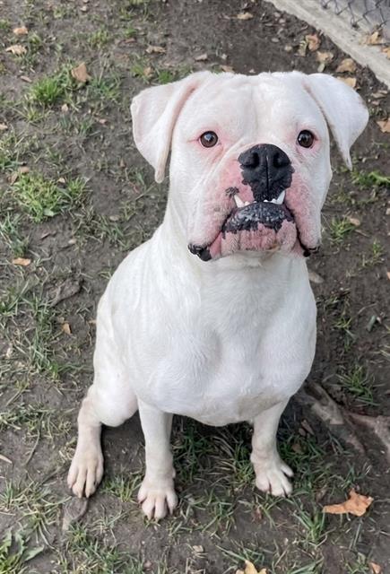 Description: I am a male, 61.80 lbs, white Boxer.