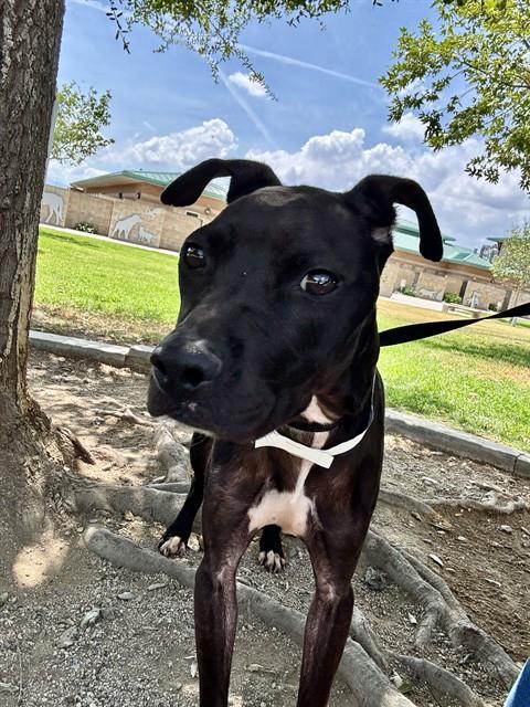 Description: I am a female, 16.50 lbs, black Pit Bull Terrier.
