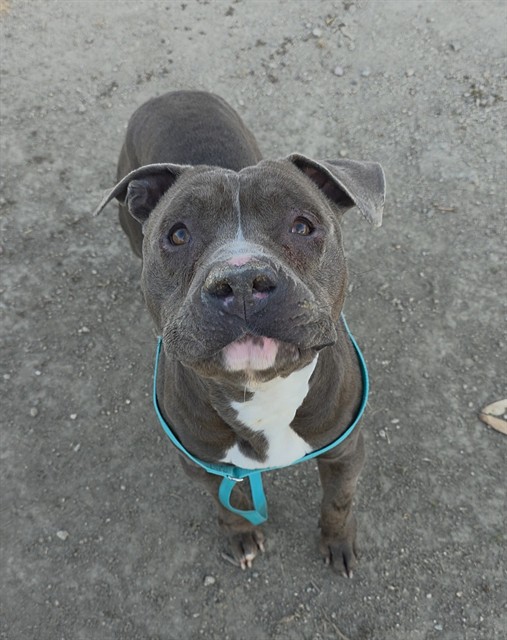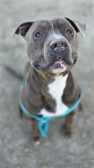 Description: I am a male, 65.00 lbs, gray and white Pit Bull Terrier mix.