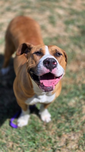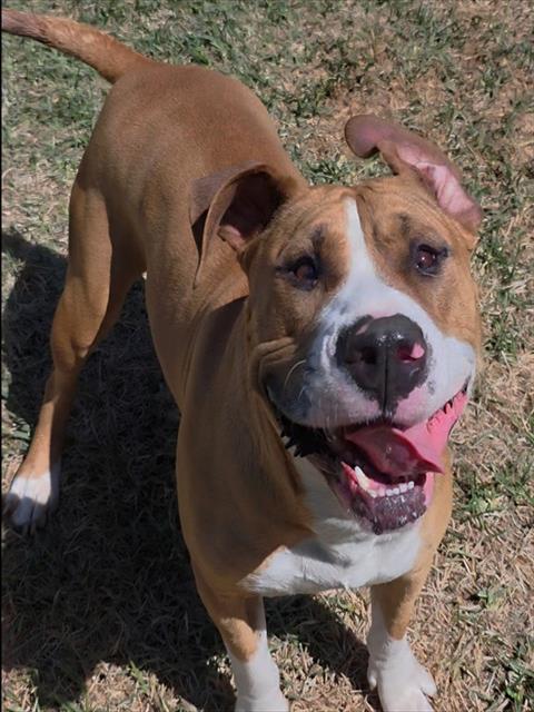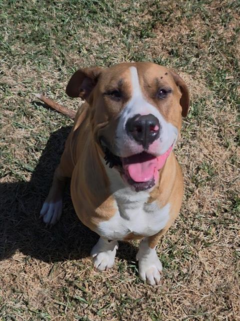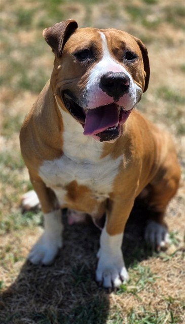 Description: I am a female, 95.00 lbs, brown and white Pit Bull Terrier.
