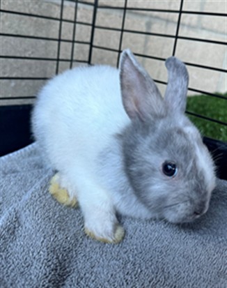 Description: My name is Meenie and I am a male, white and gray Shorthaired Rabbit.