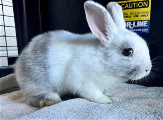Description: My name is Eenie and I am a female, white and gray Shorthaired Rabbit.