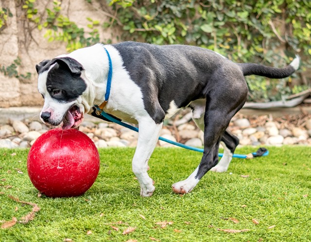 Once outside, he’s focused and engaged with his toys. He has shown friendly, appropriate interest in other dogs through the fence and has not displayed reactivity.