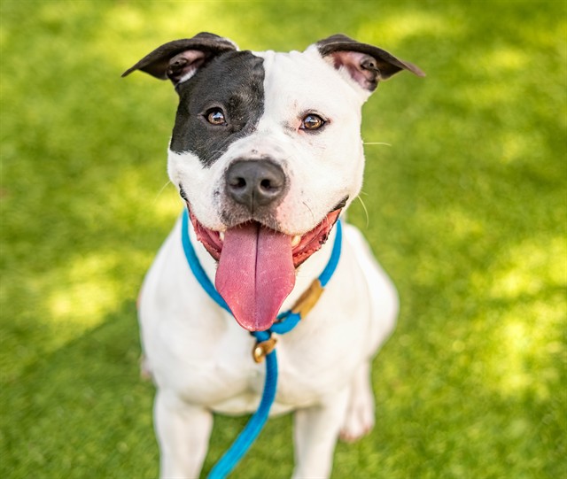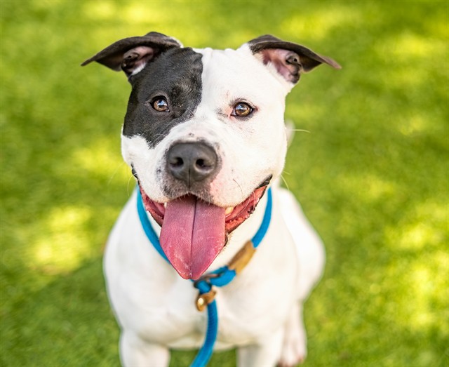 I am a neutered male, white and black Pit Bull Terrier.