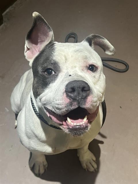 Description: My name is Corbin. I am described as a male, white American Pit Bull Terrier.