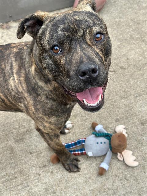 Description: My name is Punch. I am described as a male, brown brindle American Pit Bull Terrier.